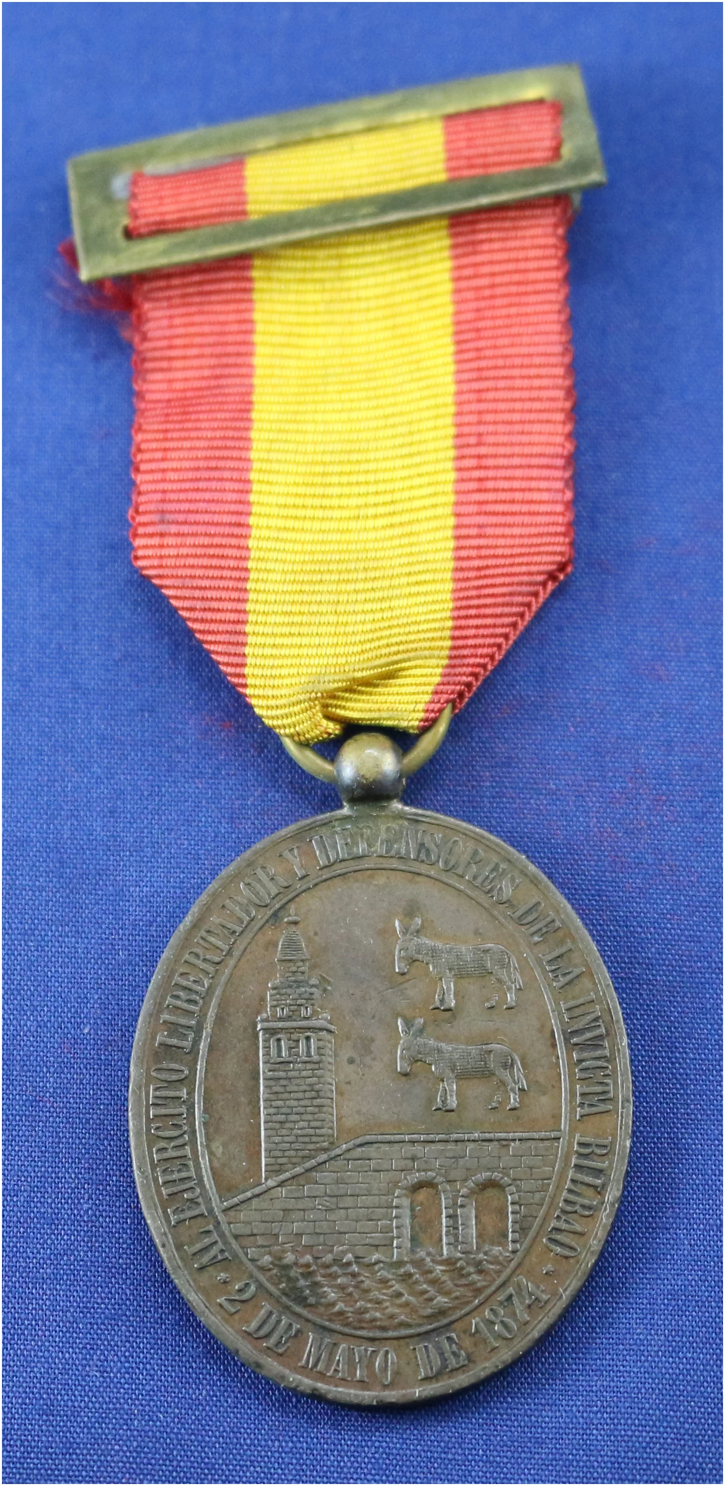 Al ejercito libertador y defensores de la Invicta Bilbao - 2 de Mayo de 1874, reverso liso, cinta con los colores de la Bandera Espanola.
