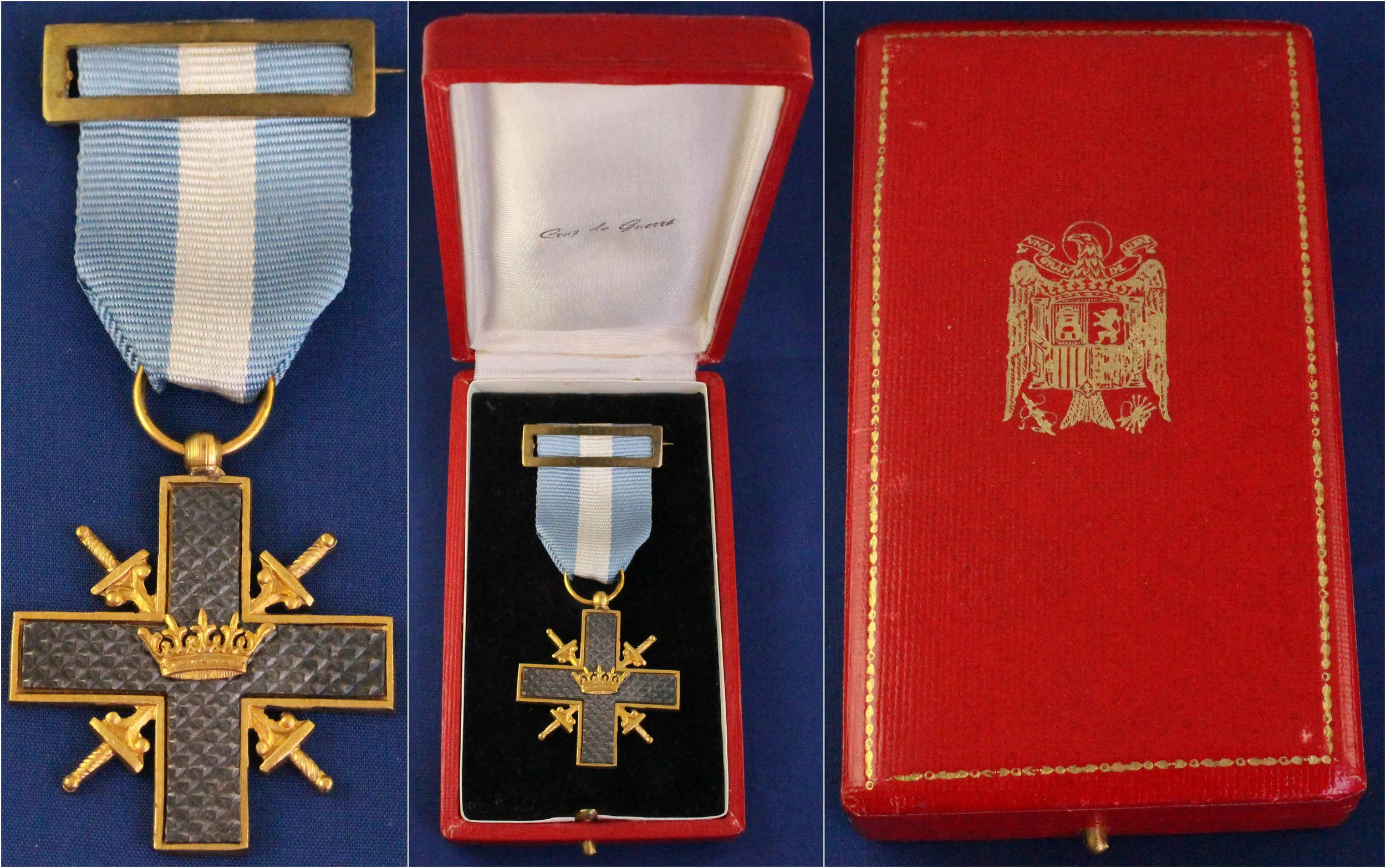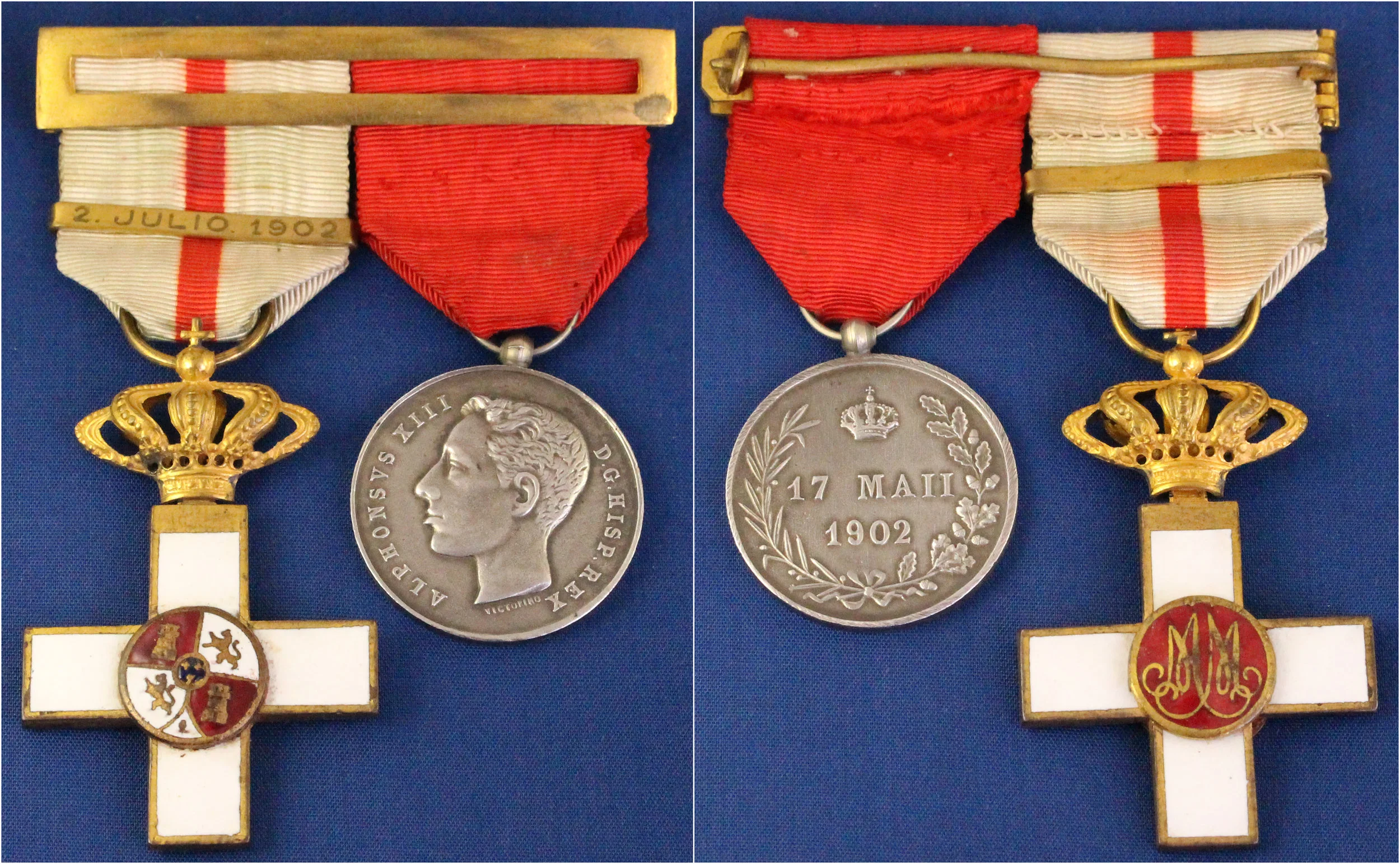 Cruz para tropa: Cruz de brazos en plata oxidada con filete de oro, corona imperial y espadas tambien en oro.